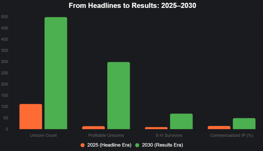 But the fine print stings: 90% failure rate, 70% SISFS grantees pre-revenue after two years, 40% “zombie startups” in incubators. X: “Headlines: 113 unicorns. Reality: 14 profitable.”